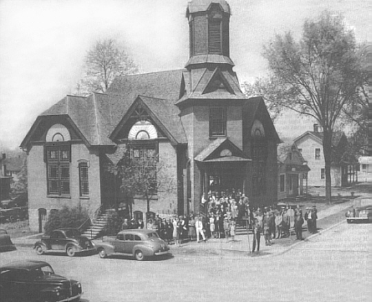 The Congregational Church of Neillsville--organized in 1891. There were 33 original members including family names of Hart, Deutsch, Chambers, Ackerman, Brown, Williams, Weinberger and Condit. Construction of the church building was completed in 1893. The above photo was taken on the 50th anniversary of the congregation, 1941. Located on the northwest corner of Fifth and West Street, in Neillsville, the church building was razed circa 1970 with the site presently being occupied by Mid-Wisconsin Bank. |
