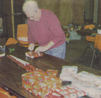 Cathy Schnabel helps with gift wrapping for the Christmas Angel Project. Schnabel and daughter Stacy Schilling coordinated the project which provides gifts, clothing and food for needy area families. (Contributed photo)