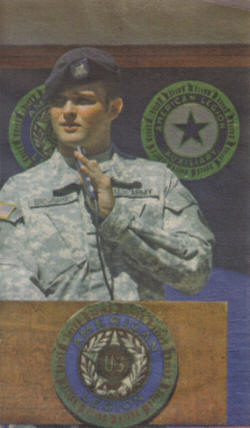 Neillsville resident and Wisconsin National Guard member Charlie Brosanhan, who recently finished his second tour of duty in Iraq, addresses those attending Neillsville’s Memorial Day service at the Neillsville City Cemetery Monday, May 31, 2010. Brosanhan told the crowd veterans are the country’s biggest heroes. (Photo by Peter Spicer/Clark County Press)