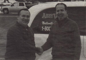 Clark County Social Services Director Ronald Schmidt (l) shakes hands with Neillsville Mayor Dewey Poeschel Monday, Jan. 10, 2011, in front of an Abby Vans vehicle. Social Services partnered with the city to start the Clark County Taxi, which is available to all County residents. Abby Vans was contracted to provide the taxi. (Photo by Peter Spicer/Clark County Press)