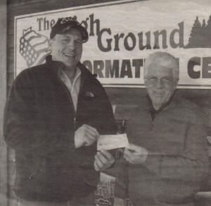 Abbotsford resident Stanton Braun (left) who attended the HMLA-367 ?Scarface? Reunion, presents Highground Volunteer General Manager Kirk Rodman (right) with a check to help The Highground obtain The Learning Center?s outdoor signage. Proceeds from the group?s ice-fishing event were donated to the cause. (Contributed photo)