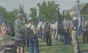 Part of the Independence Day celebration at The Highground the morning of July 4 was the tribute paid to the Wisconsin soldiers who sacrificed their lives in Iraq and Afghanistan. Each and every one of their names was read as the ceremony attendees gathered together in a circle with Neillsville American Legion Post 73 and Loyal American Legion Post 175. (Photo by Nancy Halterman/Clark County Press)