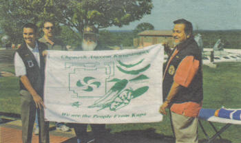 Pala Band of Mission Indians tribal representatives and military veterans Kilma Lattin (l) Hoard Diaz (center) and Robert Lavato (r) present their tribal flag at a ceremony held at The Highground Friday, Aug. 8, 2008 (Photos by Peter Spicer/Clark County Press)