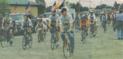 Tom Miller (front) leads the way to The Highground Sunday, Aug. 9, with all bicyclists who made their way to The Highground from six different routes during the 25th Tribute Ride. Miller founded the ride in 1985. Tom Kingsbury honored the 25th anniversary by riding 1,500 miles and making 30 stops along the way. As miller led the way to The Highground, Kingsbury followed behind the group of cyclists.