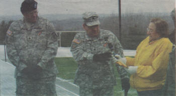 A microphone with a vial of earth from an October Legacy Stone placement is passed from hand to hand, allowing Veterans Day Celebration attendees to share their thoughts, including those from Wisconsin National Guard Senior Advisor Lieutenant Colonel Mark Rodwell (l), a guest speaker at the event. The celebration was held Tuesday, Nov. 11. (Photo by Peter Spicer/Clark County Press)