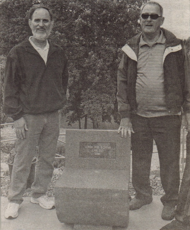 A World War II red granite bench was dedicated for Leroy and Agatha Carlson by their sons, Ned and Dave Carlson.