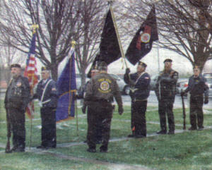 The Neillsville Color Guard prepares to present Colors during a snowy and cold Veterans Day Celebration held at The Highground Tuesday, Nov. 11. Wisconsin National Guard Senior Advisor Lieutenant Colonel Mark Rodwell spoke at the event. (Photo by Peter Spicer/Clark County Press)