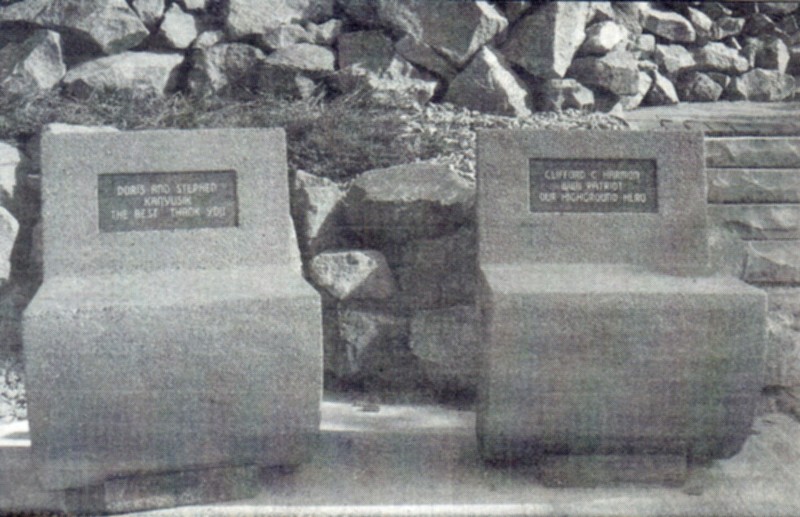 The Family of Clifford Harmon (above) posed next to a World War II bench dedicated in his honor at The Highground Sept. 12. Harmon was a World War II veteran, porch greeter at The Highground on weekends and a Highground Hero. Six benches were dedicated Sept. 12. The Kanyusik family dedicated the bench (below on left) honoring Stephen and Doris Kanyusik, who reside in Sterling Heights, MI. Stephen Kanyusik is a World War II veteran who designed the globe on the World War II Tribute at The Highground. The Harmon bench is on the right (below). (Contributed photo)
