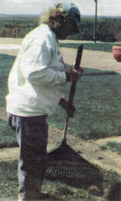 Peg Connelly of Augusta joins those cleaning up the main part of the grounds. Connelly also took her turn serving as a greeter later in the day, a job directing helpers and visitors to various sites.