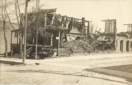 Finally, O誰eill was settling down after years of traveling here and there, staying at each stop for a year or two, having sawmill business he established, prospering and now was enjoying the comforts of his new house. It was in December of 1846 that he planned a social event at his residence. Settlers from miles around were invited to the dancing party. To be the guests of a party in such a sparsely inhabited frontier created inestimable enjoyment for settlers. Among those attending were: W. T. Price, Jacob Spaulding, Jonathon Nichols, Thomas Sturges, B.F. Johnson, Levi Avery, John Perry and wife, Mr. Yeatman, Mr. And Mrs. Van Austin and daughter, Joseph Stickney, Alonzo Stickney, Miss Susan Stickney, Benjamin Wright, Samuel Wright, the Misses Wright, Thomas Douglass, Robert Douglass, Mark Douglass, Miss Lucinda Nichols, and some others. Hudson Nichols and James Bennett were the fiddlers, and the dance kept up until daylight on Christmas morning. That day the guests returned to their homes and Mr. O誰eill, hitching up his team, accompanied the Douglasses to their farm, near Melrose. The Black River was frozen over, so they made their way over the ice. The scene can be imagined, their sleighs glided along beneath the frosted, overhanging tree branches with only the sounds of jingling horse harnesses and voices of conversation breaking the outdoor silence. On that lovely Christmas morning, the happy young ladies and their genial escorts were caught up in the tranquility. That was the day O誰eill began his courtship with Miss Jane Douglass, the day his bachelorhood would start slipping away. On March 7, 1847, Miss Douglass and James O誰eill, age 36, were married at Melrose, in Jackson County, with John Valentine, Justice of Peace, officiating. The newly wed couple returned to live in Neillsville, where both were actively involved in the development of the city and county. They lived out their lives here. The O誰eill痴 had three children; Isabella and Maria, both of whom lived a number of years in Neillsville and Thomas who died in 1862. Mrs. O誰eill died in 1873 and O誰eill passed away in 1882, age 71, the year Neillsville was charted as a city.