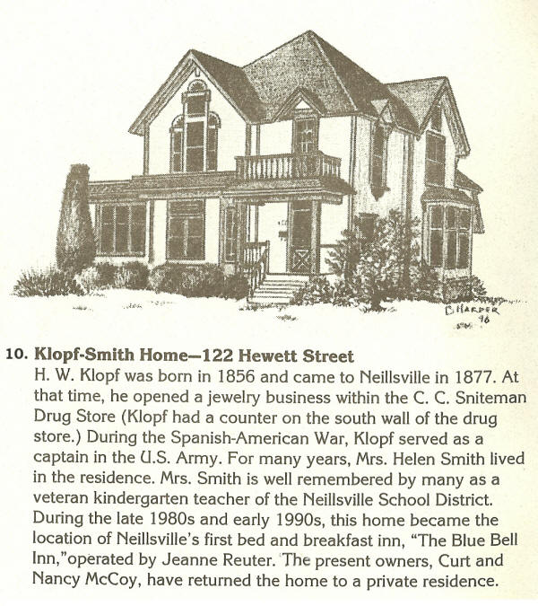 10. Klof-Smith, 122 Hewett H. W. Klopf was born in 1856 and came to Neillsville in 1877. At that time, he opened a jewelry business within the C. C. Sniteman Drug Store (Klopf had a counter on the south wall of the store). During the Spanish-American War, Klopf served as a captain in the U.S. Army. For many years, Mrs. Helen Smith lived in the residence. Mrs. Smith is well remembered by many as a captain in the U.S. Army. For many years, Mrs. Helen Smith lived in the residence. Mrs. Smith is well remembered by many as a veteran kindergarten teacher of the Neillsville School District. During the late 1980s and early 1990s, this home became the location of Neillsville's first bed and breakfast inn, "The Blue Bell Inn," operated by Jeanne Reuter. The present owners (2006), Curt and Nancy McCoy, have returned the home to a private residence. B. Harder Sketch. |