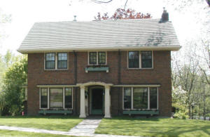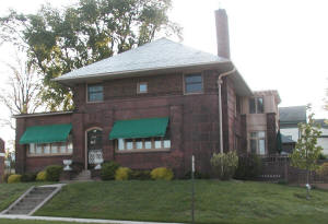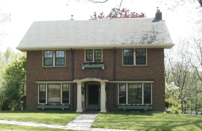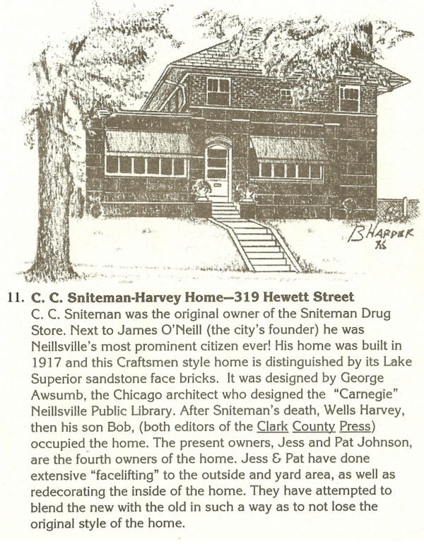 11. C. C. Sniteman House (1915-1917)-319 Hewett St. C. C. Sniteman was a graduate of the Philadelphia College of Pharmacy. He had been encouraged to seek a cool climate since he suffered from malaria. For 61 years Sniteman filled prescriptions until his death in 1940 at the age of 91. Sniteman commissioned Chicago architect George Awsumb to design his home. Awsumb's talents had already been observed with his design of the Neillsville Carnegie Library. His intent was that the library and the Sniteman house were to be harmonious in nature. The Sniteman house is a fine representation of Prairie Style architecture. This home is currently (2007) owned by Jess and Pat Johnson. |