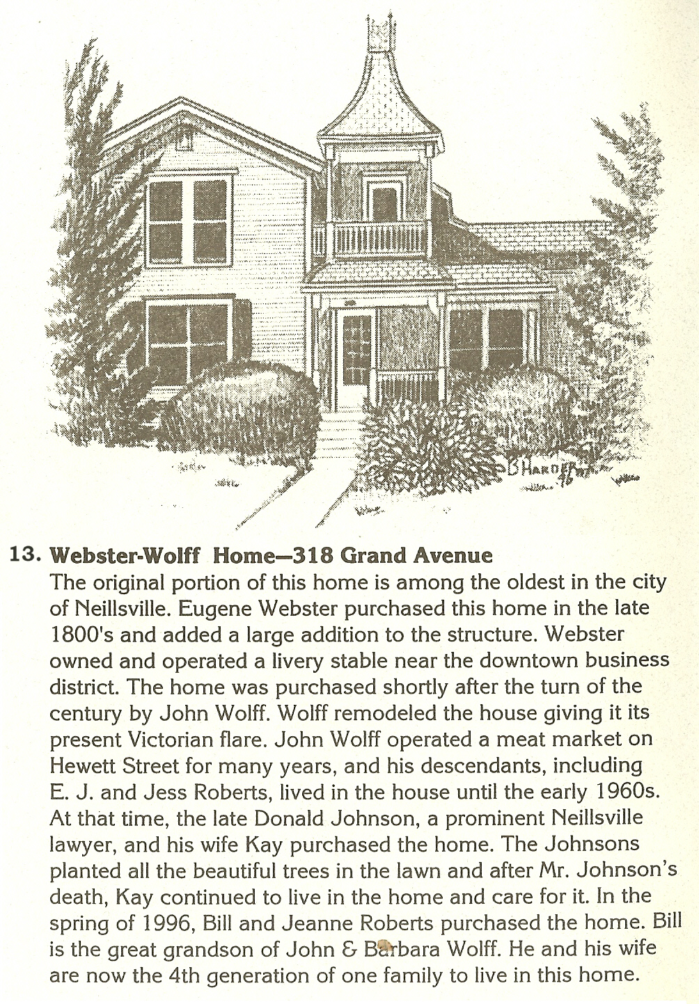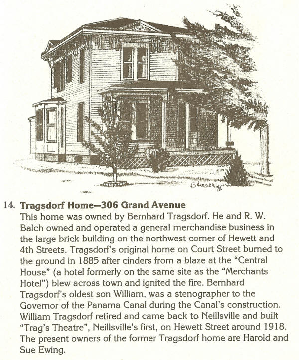 14. Tragsdorf -306 Grand Ave. This home was built late in the nineteenth century in the Italianate style on Grand Avenue -- one of Neillsville’s most desirable neighborhoods of the time. A family by the name of Montgomery built the home. In the 1890s, shortly after the home’s construction, the property was purchased by Bernhardt and Bertha Tragsdorf. Bernhardt, or “Benny”, was one of Neillsville’s prominent businessmen – having been a partner in the general merchandise firms of “Balch & Tragsdorf” and “Tragsdorf, Zimmerman & Company”. The Tragsdorf House was home to the family’s seven children: William, Clara, Elsie, Lillian, Freddie, Walter and Edna. After Bernhardt’s death in 1909, the home remained in Bertha’s hands until her death in 1938. Subsequent owners of the home have included: Otto Zaeske and Glenn Short. The home is currently owned by Pete and Sue Ewing. This home is now owned by Pete Ewing, the plumber. B. Harder Sketch. |