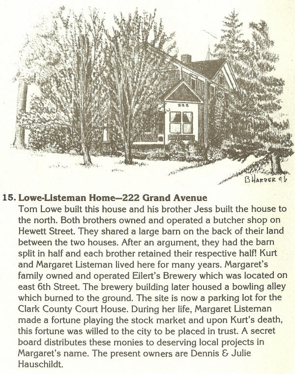 15. Lowe-Listeman-222 Grand Ave. Tom Lowe built this house and his brother Jess built the house to the north. Both brothers owned and operated a butcher shop on Hewett Street. They shared a large barn on the back of their land between the two houses. After an argument, they had the barn split in half and each brother retained their respective half! Kurt and Margaret Listeman lived here for many years. Margaret's family owned and operated Eilert's Brewery which was located on east 6th Street. The brewery building later housed a bowling alley which burned to the ground. The site is now a parking lot for the Clark County Court House. During her life, Margaret Listeman made a fortune playing the stock market and upon Kurt's death, this fortune was willed to the city to be placed in trust. A secret board distributes these monies to deserving local projects in Margaret's name. The present owners are Dennis & Julie Hauschildt. Alternate View; B. Harder Sketch. |