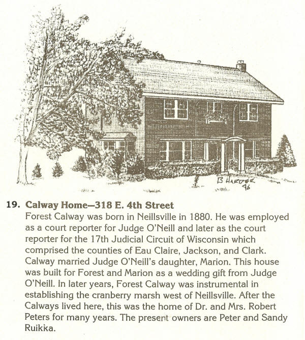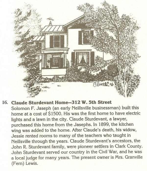 16. Claude Sturdevant Home-312 W. 5th Street Solomon F. Jaseph (an early Neillsville businessman) built this home at a cost of $1,500. His was the first home to have electric lights and a lawn in the city. Claude Sturdevant, a lawyer, purchased his home from the Jasephs. In 1899, the kitchen wing was added to the home. After Claude's death, this widow, Jessie, rented rooms to many of the teachers who taught in Neillsville through the years. Claude Sturdevant's ancestors, the John R. Sturdevant family, were early pioneer settlers in Clark County. John Sturdevant served our country in the Civil War, and he was a local judge for many years. The present owner is Mrs. Granville (Fern) Lewis. B. Harder Sketch. |