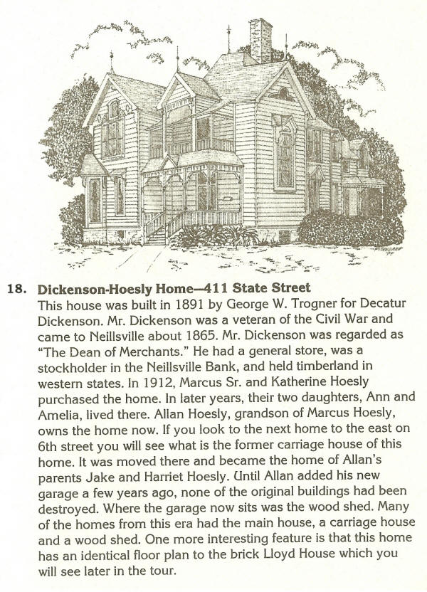 18. The Hoesly house-411 State St. Located at the corner of State and 5th Streets this home is one of Trogner’s carpentry masterpieces. This house was built in 1891, and originally owned by Decatur Dickinson who was a stockholder in the Neillsville Bank and held timberland in Western states. In 1912, Marcus, Sr. and Katherine Hoesly purchased the house for their home. A daughter Ann owned it later. Ann’s brother, Jacob and his wife, Harriet live in a home to the east of that house. Jacob and Harriet’s son, Allen now resides in his grandfather’s house. In 100 years, only two family names have been its owners. This house was built in 1891 by George W. Trogner for Decatur Dickenson. Mr. Dickenson was a veteran of the Civil War and came to Neillsville about 1865. Mr. Dickenson was regarded as “The Dean of Merchants.” He had a general store, was a stockholder in the Neillsville Bank, and held timberland in western states. In 1912, Marcus Sr. and Katherine Hoesly purchased the home. In later years, their two daughters, Ann and Amelia, lived there. Allan Hoesly, grandson of Marcus Hoesly, owns the home now. If you look to the next home to the east on 6th Street you will see what the former carriage house of this home is. It was moved there and became the home of Allan’s parents Jake and Harriet Hoesly. Until Allan added his new garage a few years ago, none of the original buildings had been destroyed. Where the garage now sits was the wood shed. Many of the homes from this era had the main house, a carriage house and a wood shed. One more interesting feature is that this home has an identical floor plan to the brick Lloyd House which you will see later in the tour. Additional Sources: #1, #2, B. Harder Sketch. |