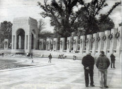 The National World War II Memorial includes 56 pillars, each 17 feet high. Each pillar is inscribed with the name of one of the 48 U. S. States in 1945, as well as the District of Columbia, the Alaska Territory, Hawaii Territory, the Commonwealth of the Philippines, Puerto Rico, Guam, American Samoa and the U.S. Virgin Islands. In this photo, the Wisconsin pillar is located just to the right of the large arch. Robert Luchterhand and Bernard Walker made the trip to Washington, D. C., in April 2010. (Contributed photo)