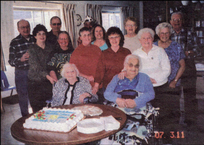 Several members of WFLA Lodge 408, City Point, met at the Neillsville Health and Rehab Center in Neillsville on March 10th to commemorate the 75 year members, Ana Adamac (left), 93 years old, and her sister, Christine Venzke, age 95, who are residents of the Center, and are 75-year members of the Lodge 408. Presenting their 75-year membership pins were their children, Marion Genteman and David Venzke. Others that were present were David’s wife Wanda, and Marion’s husband, Edward Genteman, Andy and Helen Dasko, Frank and Jane Sojka, Doreen Mazdzreiz and Darlene Barek, Angela Garbisch and Amber Pischer as a guest. Cake and ice cream were served while the members visited. (Contributed photo)