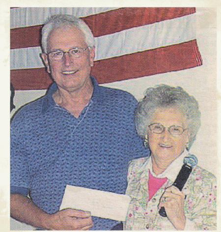 Lorraine Shaw (r), representing the combined classes of 1940 through 1946, presented a check for $600 to Clem Schultz of the American Legion when the class reunion was held at the Legion Sept 12.
