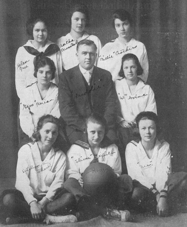 Girl's Basketball: Evelyn Irvine-L.F.; Genevieve Herian-L.G.; Bertha Bronstad-Center; Sylvia Griffith-Capt. R.F.; Ethelyn Shew-First Sub.; Frances Glass-Second Sub.