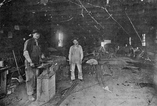 Stanley SmithyThe Stanley Blacksmith Shop 1914, The smith, a mighty man "was" he, with large and sinewy hands. And the muscles of his brawny arms "were" as strong as iron bands. Longfellow. Today the Stanley Machine Works. Man at anvil, the late Frank Verweyst. Who knows the other man? Picture courtesy of the Stanley Machine Shop, Stanley, Wis. Walter Wartolec provided this picture from a copy of the Northern Broadcaster, Messenger of the Chippewa Valley - Flambeau Country, dated April 3, 1964. |