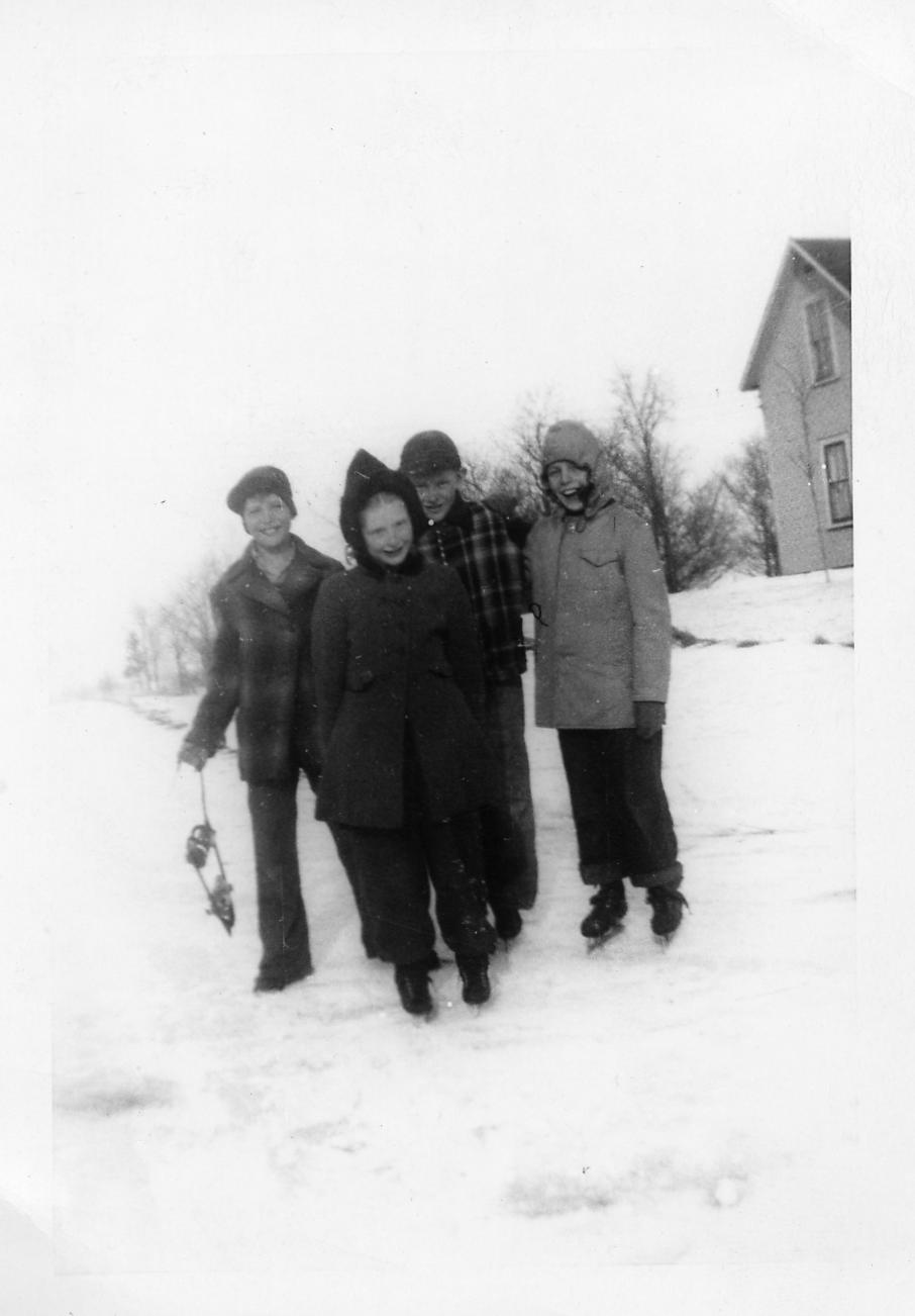 Leonard Gutowski (carrying strap-on skates), Carol Rasmussen, Paul