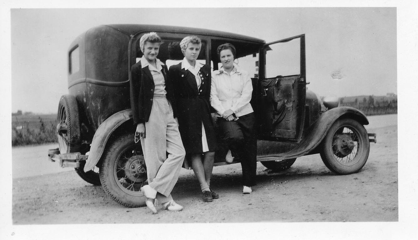 Phyllis Forster, Phyllis Tollefson, Sylverne Peet with Vern Peet's car,