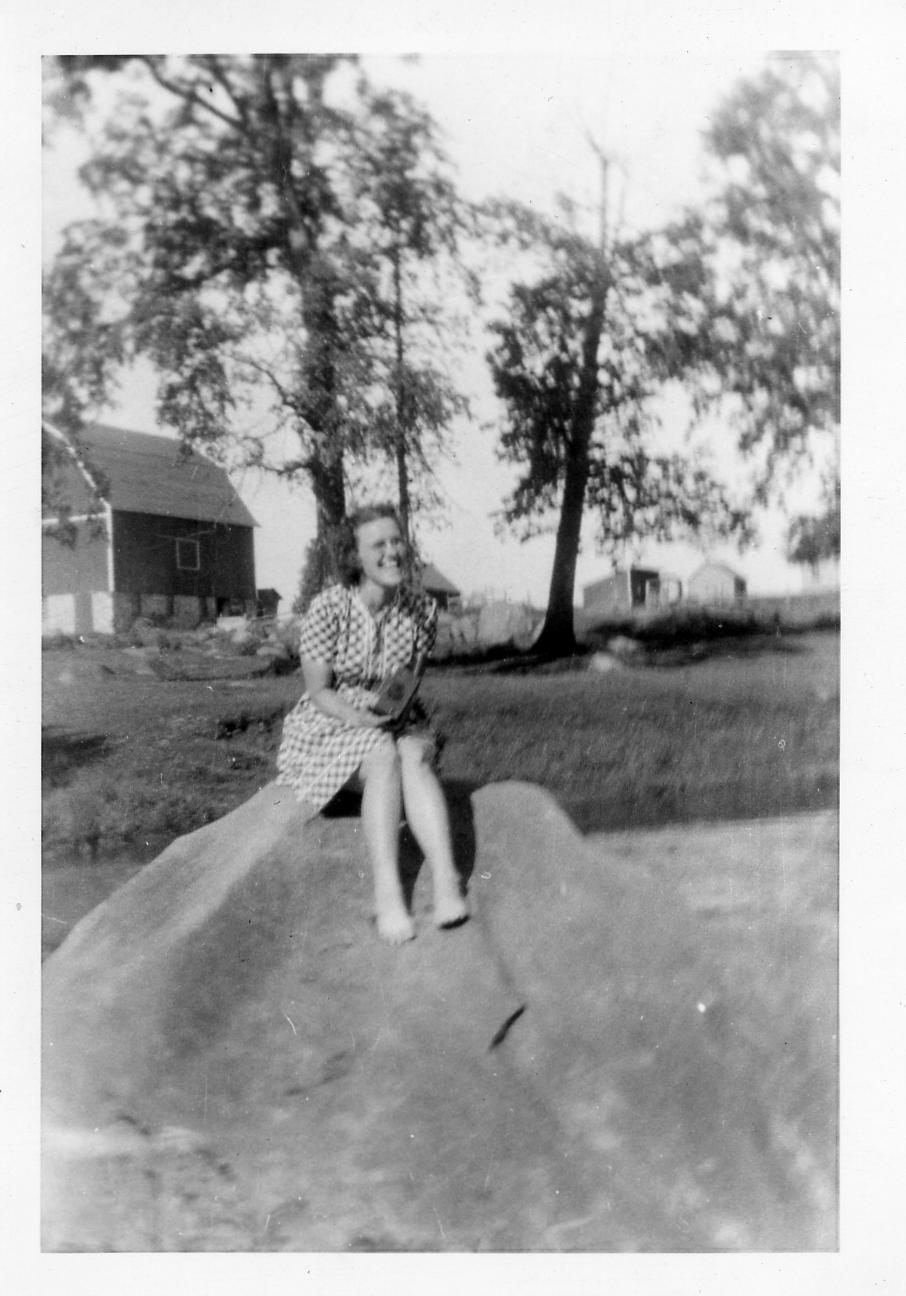 Sylverne Peet on rock in North Fork River just north of Hwy 29 Bridge.