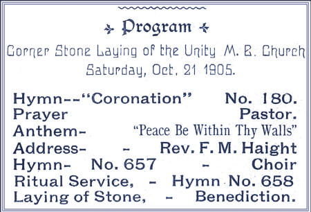 In the earlier days we used to have revival meetings in tents, and several times we have had special help for such meetings. The Unity Church has to its credit, one girl, Miss. Venda Hanson who became a deaconess, who now works in Milwaukee. Our Sunday School has had a Cradle Roll for over thirty years. About 1911 or 1912 our Sunday School was organized as a Missionary Sunday School.