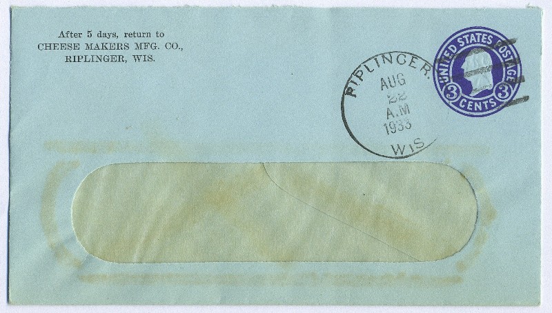 Transcribed: After 5 days return to Cheese Makers MFG. Co., Riplinger, Wis.