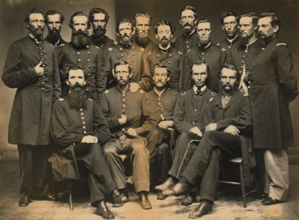 Officers of the 8th Wisconsin Infantry Standing, left to right: unidentified, Lieutenant Doty, Captain James O. Bartlett, Lieutenant Sherman Ellesworth, unidentified, unidentified, Regimental Surgeon Joseph E. Murta, unidentified but known as "Don Quixote," unidentified, Captain Theodore A. Fellows of Genoa, Henry L. Bull, Adjutant Lieutenant Charles Palmetier; seated, left to right: Captain Duncan C. Kennedy, others unidentified. |