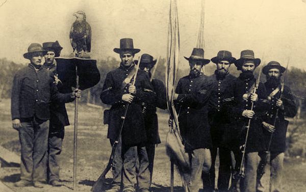 "Old Abe" and "Color Guard" of the Eighth Regiment, Wisconsin Volunteer Infantry, posed in uniform, outside with Old Abe on a shield perch. Likely Edward Homaston of Eau Claire holding the perch. Sgt. Ambrose Armitage is third from left.