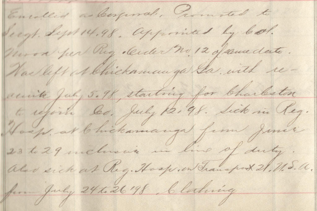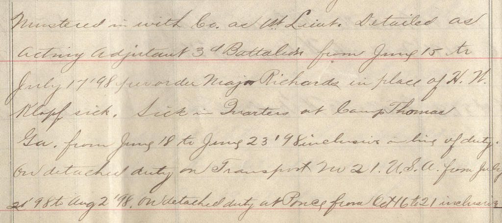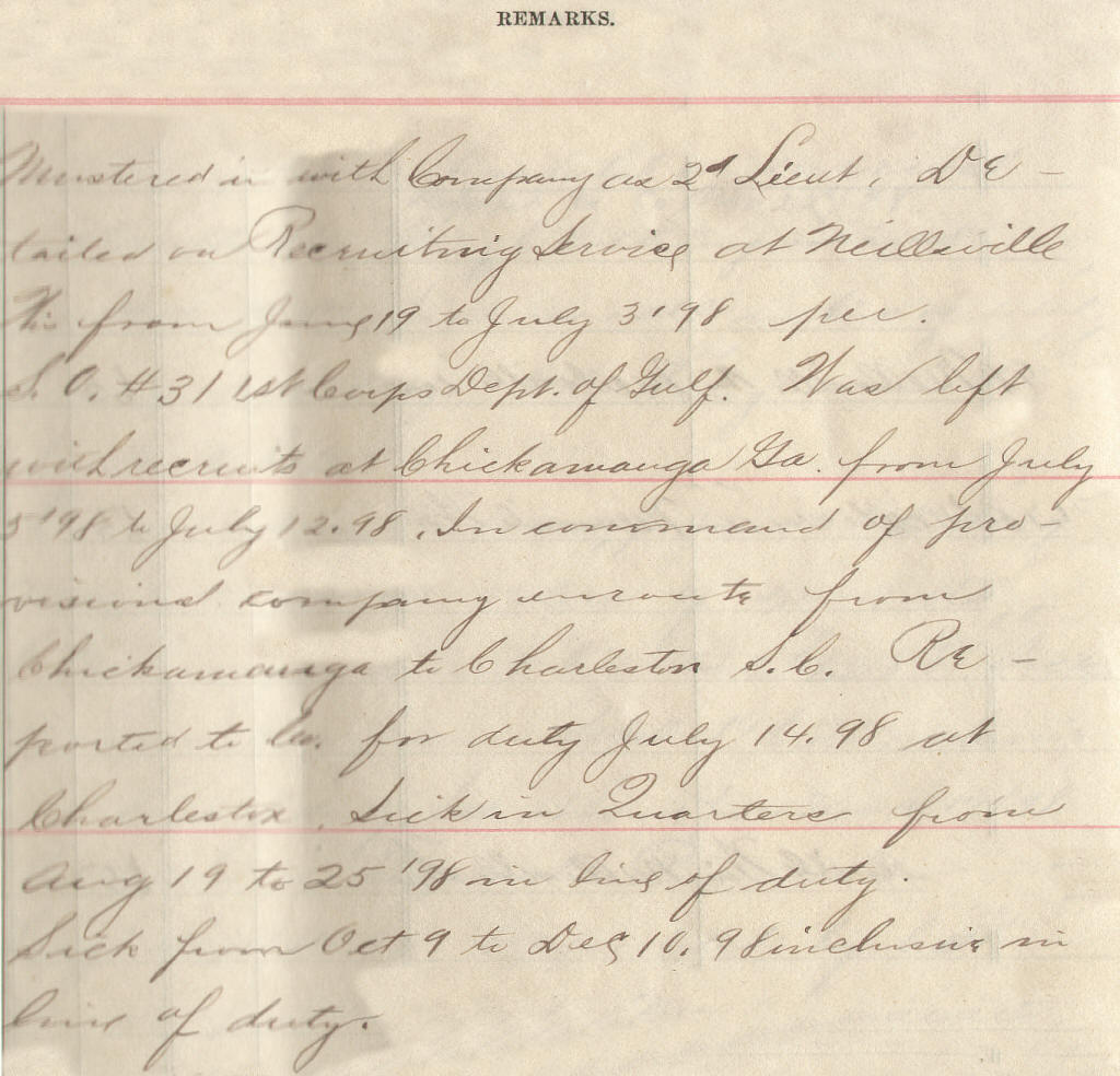 5 | Lee, Charles E. | 2nd Sgt | 4/28/1898 | Neillsville, Wis. | Capt Hommel | 2 yr | 5/11/98 | Camp Harvey, | Capt Buck | Maj Ray | 10/31/98 | Neillsville, Wis. | Neillsville, Wis. | Remarks | 2 | 4 | 21.60 | 46.08 | 32.41 | 16.25 | 94.74 | .16 | 94.58 | Signature |