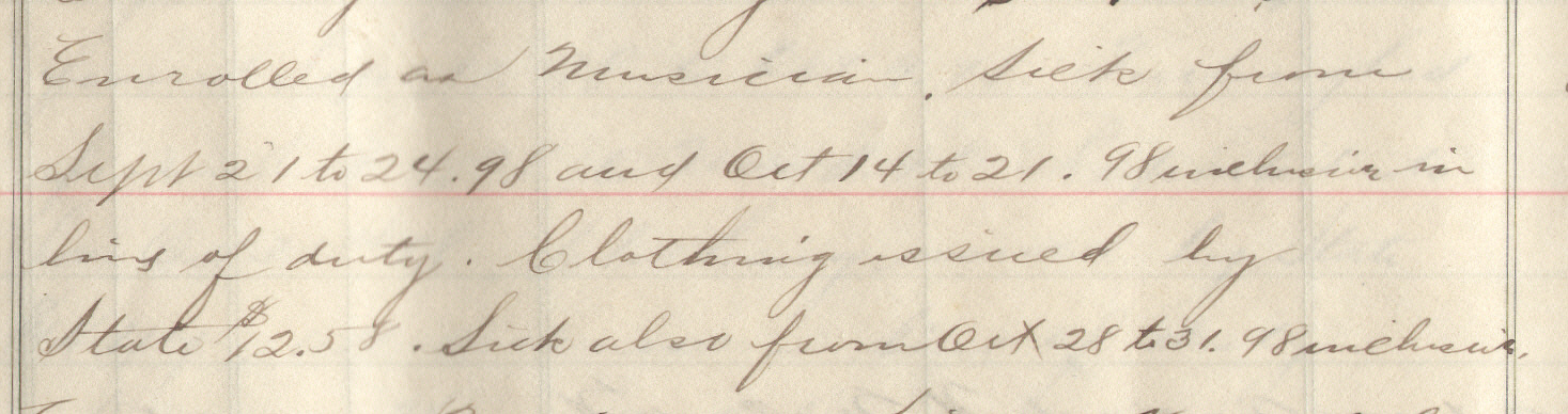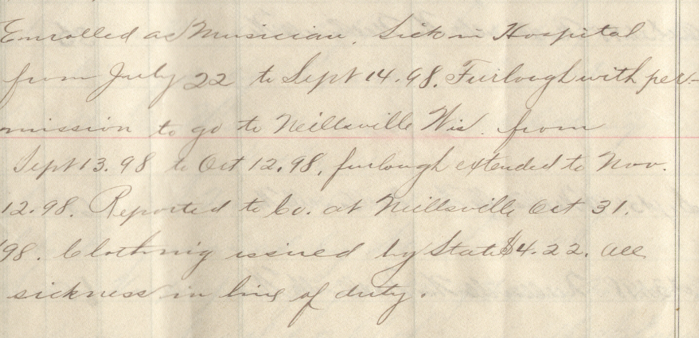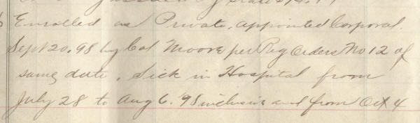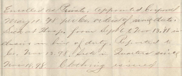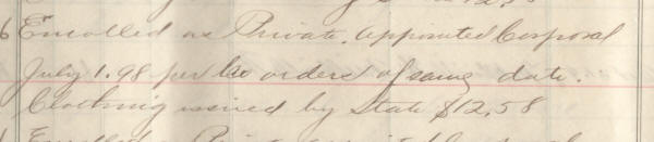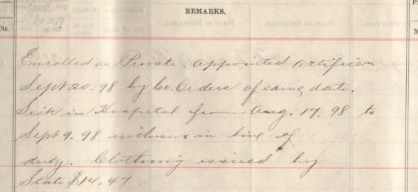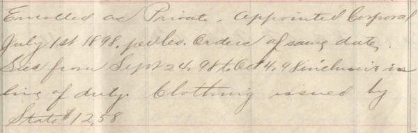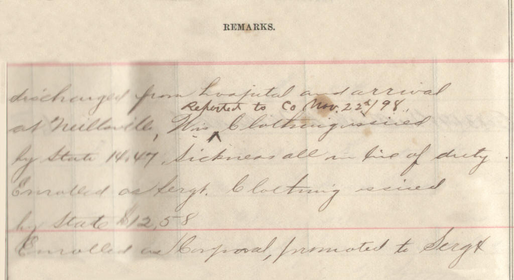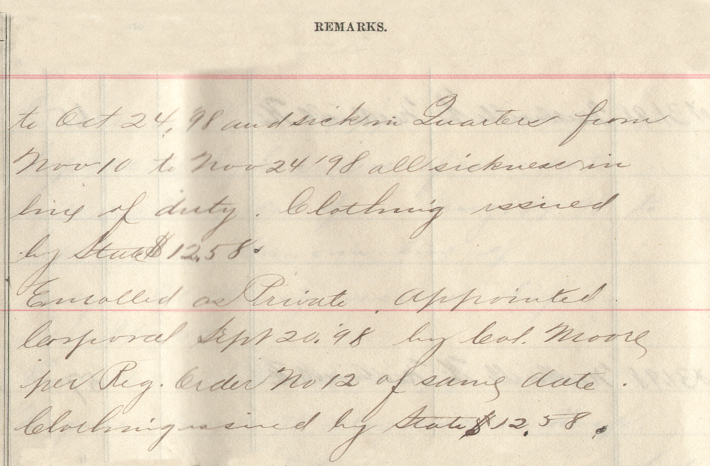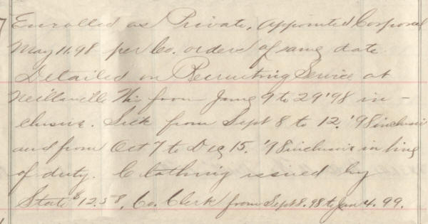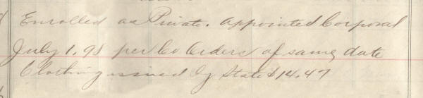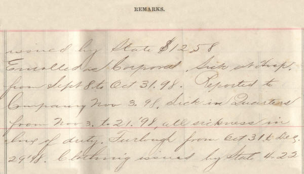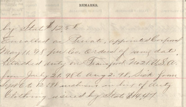 11 | Redmond, Leo | Corp | 4/28/1898 | Neillsville, Wis. | Capt Hommel | 2 yr | 5/11/98 | Camp Harvey, | Capt Buck | Maj Dagan | 10/31/98 | Neillsville, Wis. | Neillsville, Wis. | Remarks | 4 | 4 | 18.00 | 74.40 | 36.64 | 3.25 | 114.29 | 114.29 | Signature | |