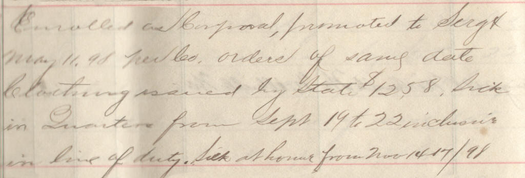 19 | Stevens, Orville A. | Corp | 4/28/1898 | Neillsville, Wis. | Capt Hommel | 2 yr | 5/11/98 | Camp Harvey, | Capt Buck | Maj Ray | 10/31/98 | Neillsville, Wis. | Neillsville, Wis. | Remarks | 2 | 4 | 18.00 | 38.40 | 13.13 | 16.25 | 67.78 | .38 | 67.40 | Signature |