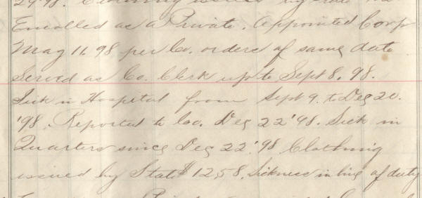 18 | Whitcomb, Hugh W. | Corp | 4/28/1898 | Neillsville, Wis. | Capt Hommel | 2 yr | 5/11/98 | Camp Harvey, | Capt Buck | Maj Walton | 10/31/98 | Neillsville, Wis. | Neillsville, Wis. | Remarks | 2 | 4 | 18.00 | 38.40 | 20.97 | 6.75 | 66.12 | .16 | 65.96 | Signature |