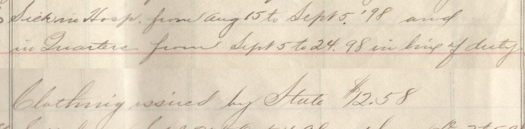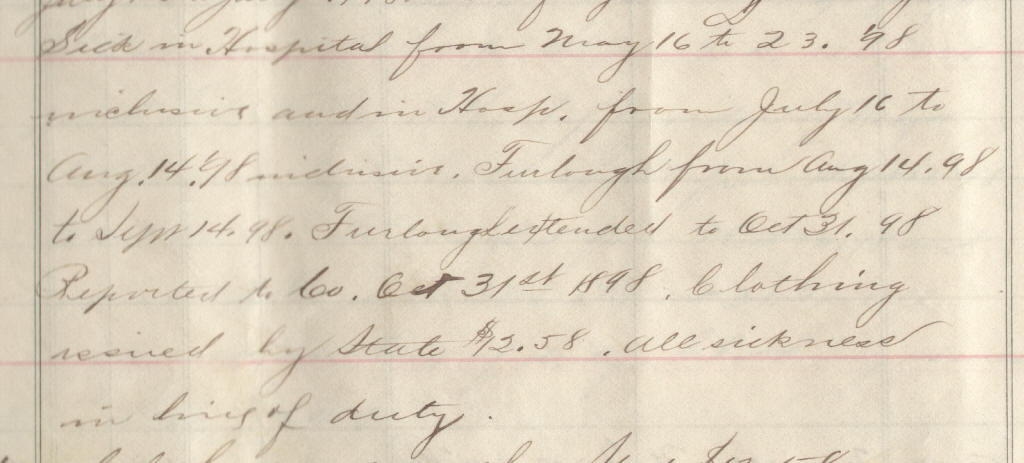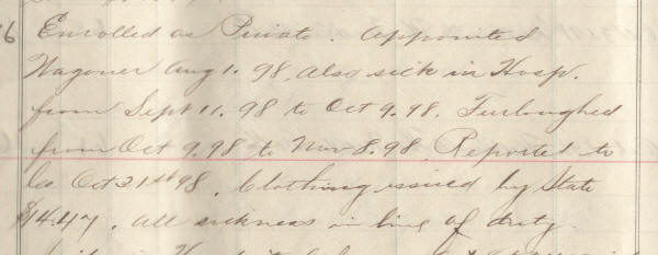 45 | Gustavson, Henry | Pvt | 4/28/1898 | Neillsville, Wis. | Capt Hommel | 2 yr | 5/11/98 | Camp Harvey | Capt Buck | Maj Ray | 10/31/98 | Neillsville, Wis. | Neillsville, Wis. | Remarks | 2 | 4 | 15.60 | 33.28 | 16.25 | 49.53 | .91 | 48.62 | Signature | |