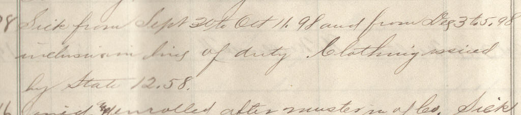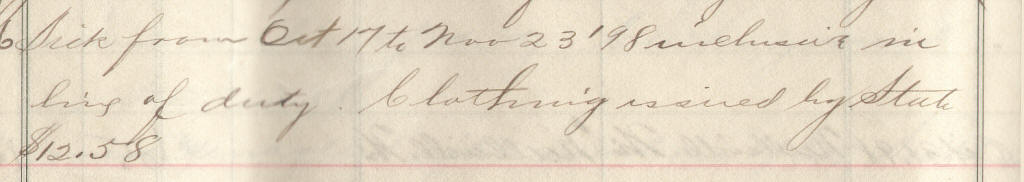 28 | Allen, Gary | Pvt | 4/28/1898 | Neillsville, Wis. | Capt Hommel | 2 yr | 5/11/98 | Camp Harvey | Capt Buck | Maj Ray | 10/31/98 | Neillsville, Wis. | Neillsville, Wis. | Remarks | 2 | 4 | 15.60 | 33.28 | .35 | 16.25 | 49.88 | 2.19 | 47.69 | Signature |