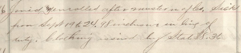 42 | Francomb, Harry L. | Pvt | 6/25/1898 | Neillsville, Wis. | Lt. Jackson | 2 yr | 6/25/98 | Neillsville | Lt. Jackson | Maj Ray | 10/31/98 | Neillsville, Wis. | Neillsville, Wis. | Remarks | 2 | 4 | 15.60 | 33.28 | 16.88 | 16.25 | 66.41 | .81 | 65.60 | Signature |