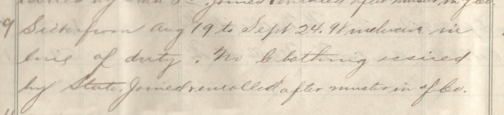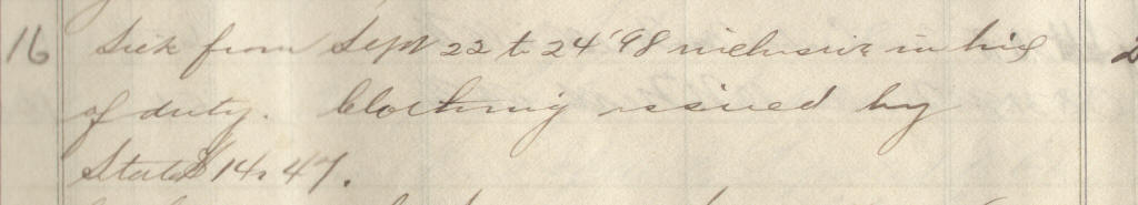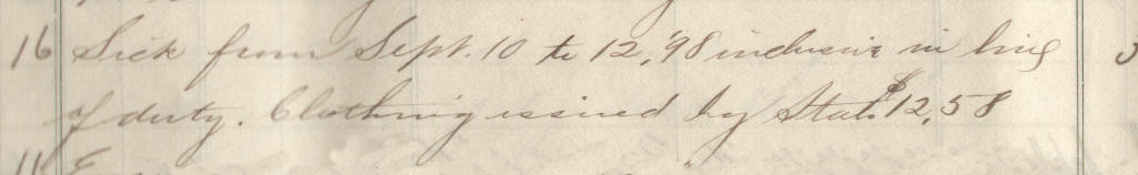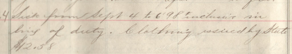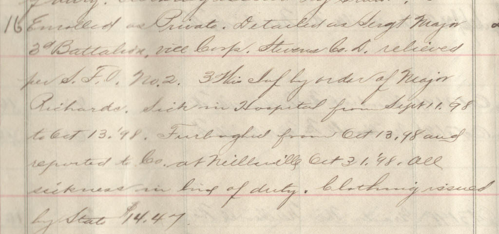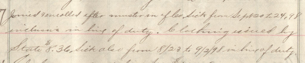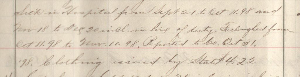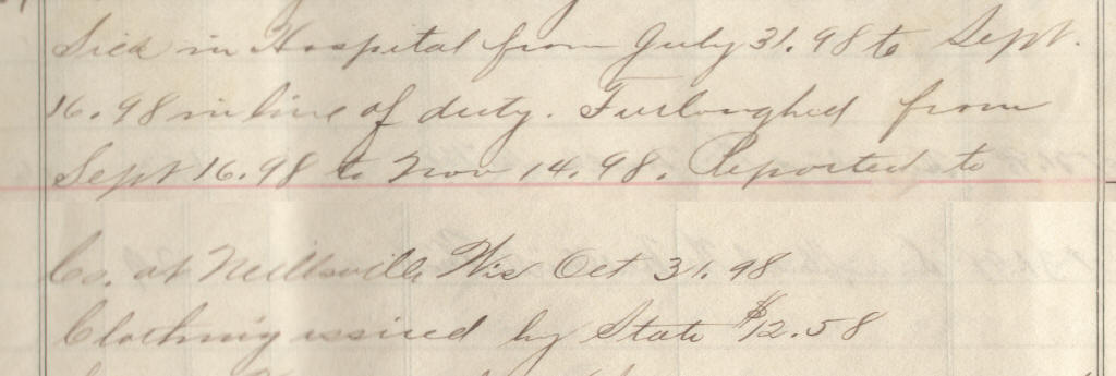 69 | Meyer, Lewis C. | Pvt | 6/25/1898 | Neillsville, Wis | Lt. Jackson | 2 yr | 6/25/98 | Neillsville | Lt Jackson | Maj Ray | 09/30/98 | Colby, Wis | Neillsville, Wis. | Remarks | 3 | 4 | 15.60 | 48.88 | 21.12 | 16.25 | 86.25 | .16 | 86.09 | Signature |