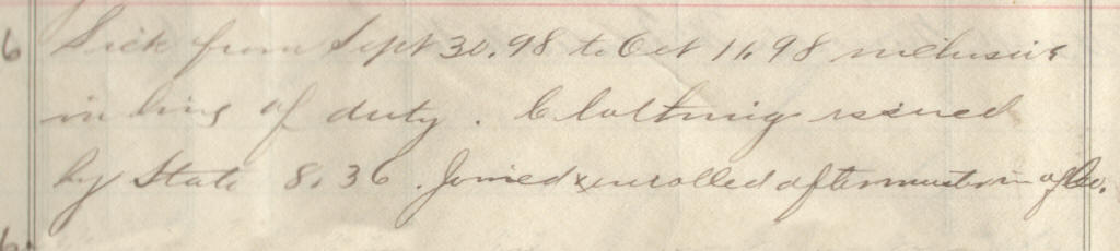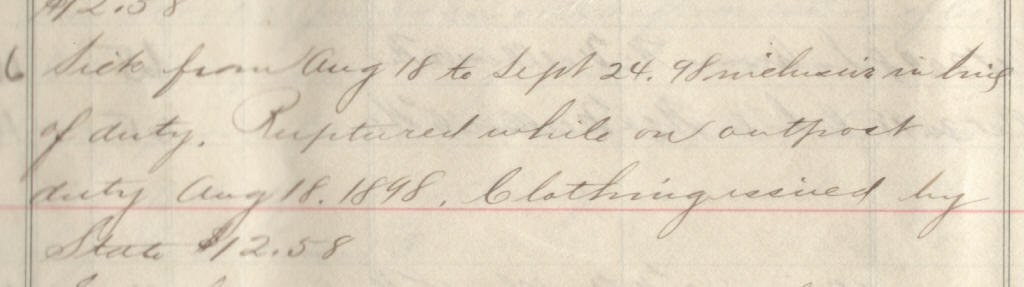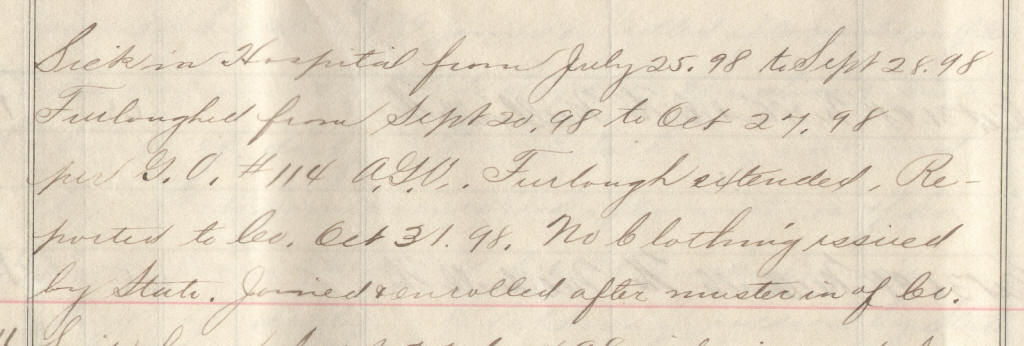 49 | Hanson, Carl | Pvt | 4/28/1898 | Neillsville, Wis | Capt. Hommel | 2 yr | 5/11/98 | Camp Harvey | Capt Buck | Maj Ray | 10/31/98 | Neillsville, Wis | Neillsville, Wis. | Remarks | 2 | 4 | 15.60 | 33.28 | 16.25 | 49.53 | .91 | 48.62 | Signature | |