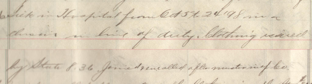 54 | Hicks, Birney | Pvt | 4/28/1898 | Neillsville, Wis | Capt. Hommel | 2 yr | 5/11/98 | Camp Harvey | Capt Buck | Maj Ray | 10/31/98 | Neillsville, Wis | Neillsville, Wis. | Remarks | 2 | 4 | 15.60 | 33.28 | 11.26 | 16.25 | 60.79 | .16 | 60.63 | Signature |