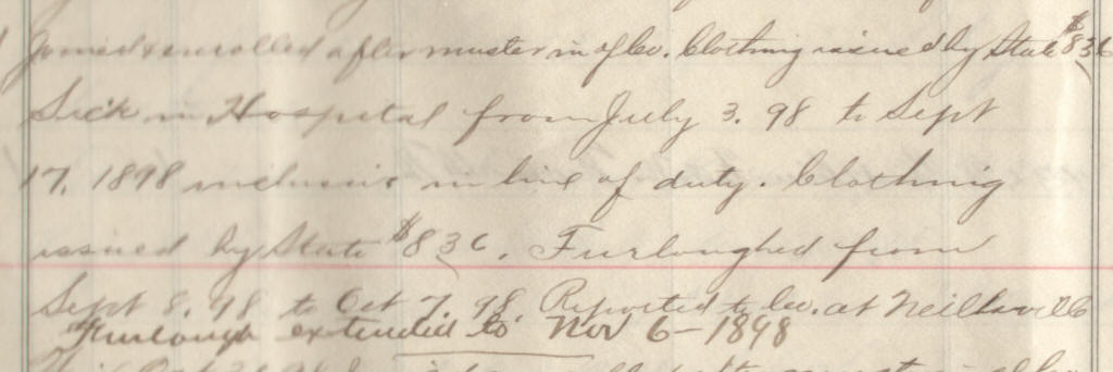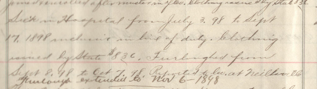 58 | James, John | Pvt | 6/25/1898 | Neillsville, Wis | Lt. Jackson | 2 yr | 6/25/98 | Neillsville | Lt Jackson | Maj Ray | 09/30/98 | Clark Co., Wis | Neillsville, Wis. | Remarks | 3 | 4 | 15.60 | 48.88 | 11.73 | 16.25 | 76.86 | .67 | 76.19 | Signature |
