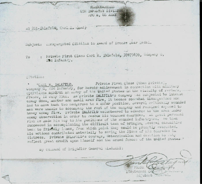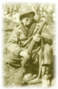 After only 12 days out of Hurtgen Forest, we were back in action and struggling to stop the German advance. The winter of 1944-45 was the coldest ever on record in Europe. On Dec. l6th, the German army launched an attack to take back the city of Luxembourg. That was the beginning of the Battle of the Bulge. Our losses were grave and yet, soldiers with battle experience were needed even after the new replacements arrived. Many of the same men, who'd fought in the Hurtgen Forest conflict, immediately returned to action. We had to use 1/2 pound blocks of TNT to blast soil loose in order to dig our foxholes. No boots were issued to us until the first of March. Because the weather conditions were so severe, many of us fought for the land those Germans were attempting to reclaim, with frozen hands and feet. In January, after an extremely bitter fight, we took Prum. It was an important city to Germany. During this battle, I was awarded the Purple Heart after being injured by shrapnel in my chin. It was not deemed to be severe enough to be sent back to the hospital. Instead, I was treated and bandaged by the medic as all were needed in the fighting. After this battle was over, we were sent to southern France where we were relieved for about l0 days following the arrival of many replacements.