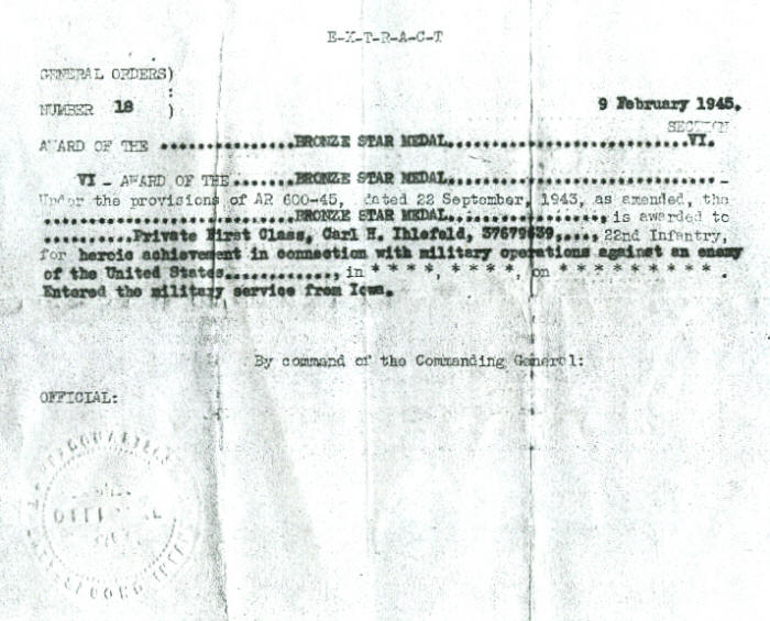 In early June we received word that our regiment would be returning to the states for a 30 day rest and recuperation before proceeding to the Pacific for further operations, but happily, the war ended beforehand. With a loss of 35,355 men, our 22nd Regiment had the highest casualty count of the division's three regiments.
