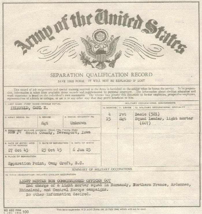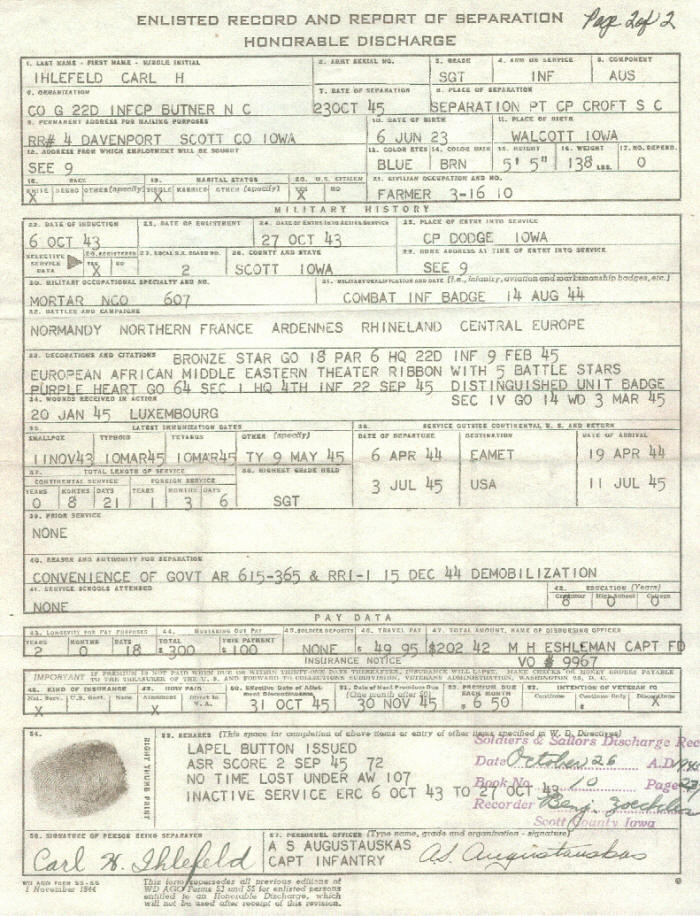 With the rank of sergeant, Co. G, 22nd Infantry, 4th Division, I was discharged from the army October 23, 1945, at Camp Croft, SC. The next day, the United Nations was officially born. I gladly returned to the quietness of our family farm. The following month the Nuremburg trials began.