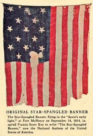 Clark County, Wisconsin 1812 Veterans The Star-Spangled Banner, formerly known as "the Great Garrison Flag", was flown over Fort McHenry in Baltimore Harbor (shown below) during the naval portion of the Battle of Baltimore during the War of 1812. It is on exhibit at the National Museum of American History, Smithsonian Institution. Seeing the flag flying over Fort McHenry on the morning of September 14, 1814, after the battle ended, Francis Scott Key was inspired to write the poem "Defence of Fort McHenry". These words were written by Key and set to the tune of "To Anacreon in Heaven" by John Stafford Smith, a popular song at the time. In 1931 the song became the national anthem of the United States. More broadly, a garrison flag is a U.S. Army term for an extra-large national flag that is flown on Sundays, holidays, and special occasions. The U.S. Navy term is "holiday colors". With fifteen stripes, the Star-Spangled Banner remains the only official American flag to bear more than thirteen stripes.