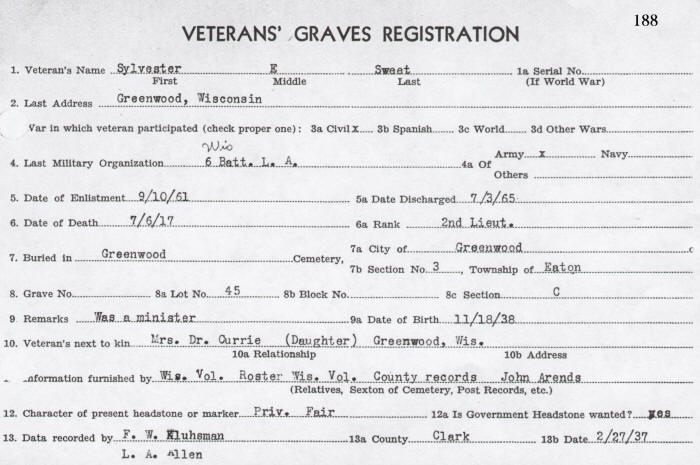 Sweet | Sylvester E. | GREENWOOD CITY | EATON | 1838-1917; Co A, 6th WI Battery; 2nd Lt.; 10Sep1861-3Jul1865; VGR#188; Bio | 18Nov1838-6Jul1917 | Mr. Dr. Currie-dau of Greenwood. |