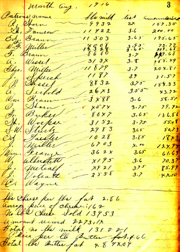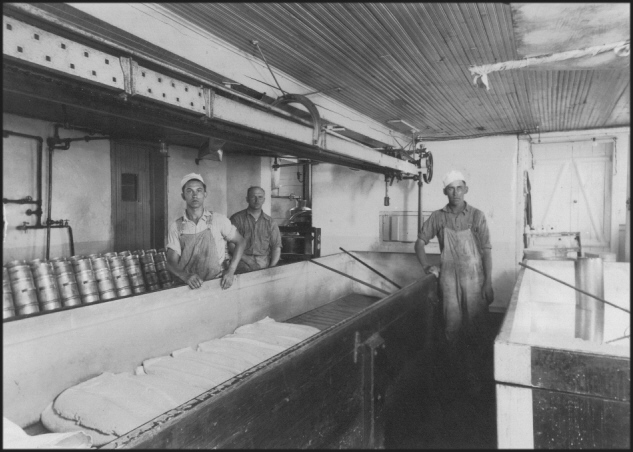 Ted Braun's Cheese Factory as it looked around 1930.  Ted is to the left, with Art Woldt behind him and Toyvol Talso.