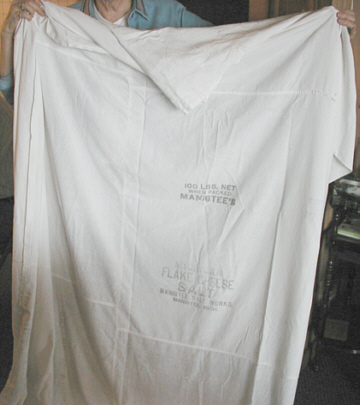 Cheesemaker's salt came in large white sacks which we later used as sheets.  Nothing seemed to wash out the printed markings, short of destroying the fabric.  June Wittwer--Daughter of Ted Braun.
